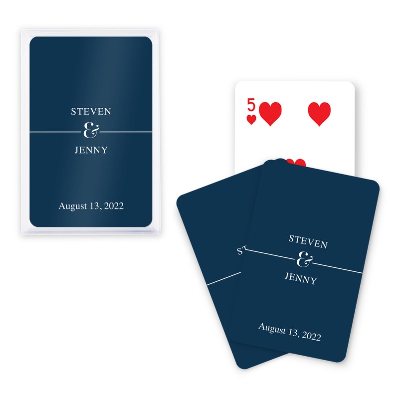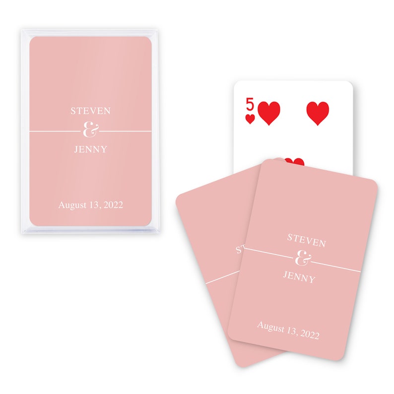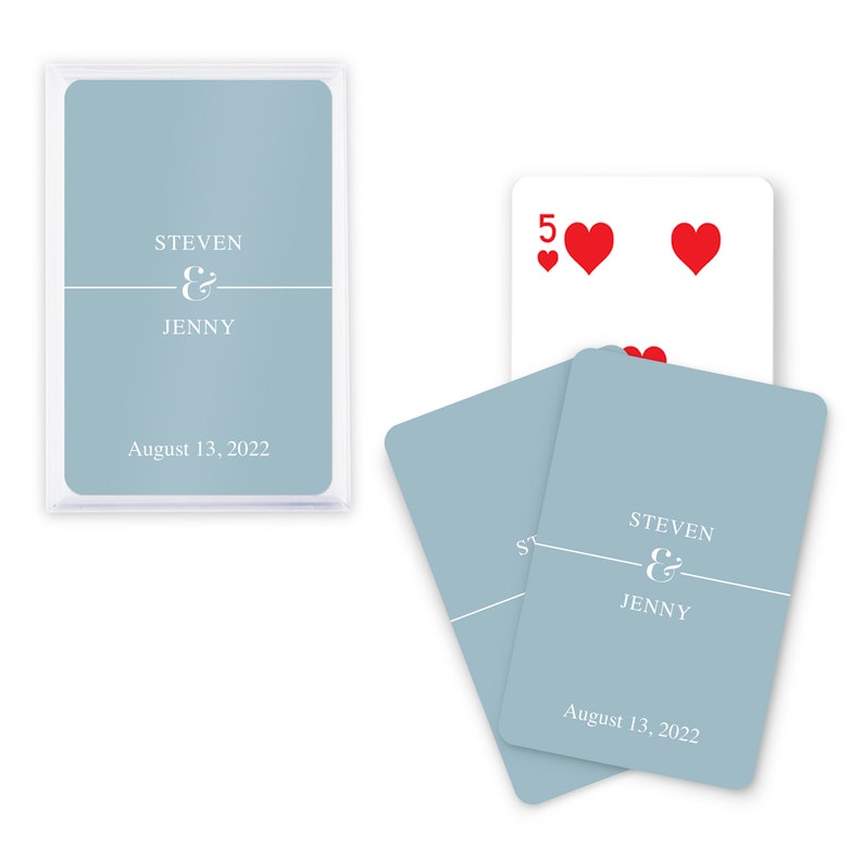 These unique custom playing card favors make any card game fun! Perfect for guests at a bridal shower or wedding reception, this unique custom deck of cards is the best party favor that will entertain any card enthusiast for an inexpensive price. They can be reused for days at the beach, cold winter days, or traveling to far away destinations. They are a useful and practical wedding favor that are great for games such as poker and Go Fish. Enjoyable for adults and children, they make a creative accessory for all brides to add to their wedding day!